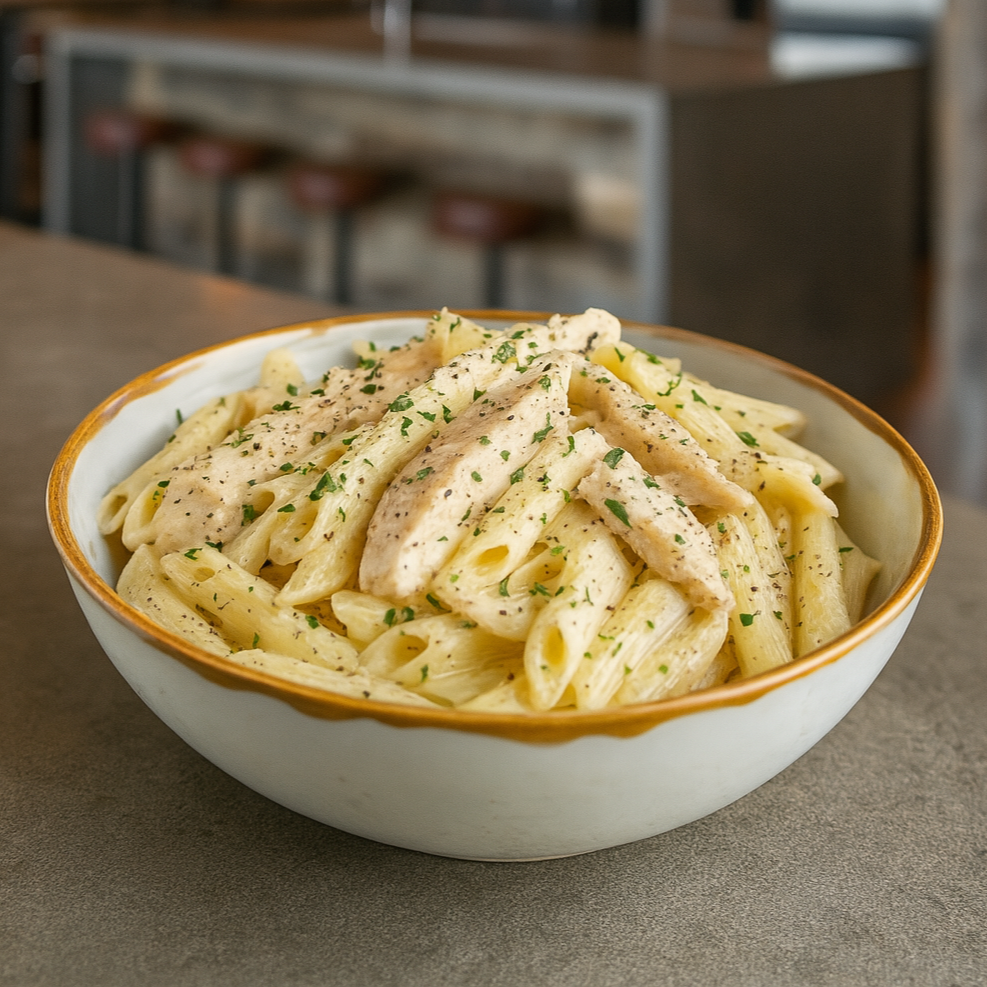 Tender chicken marinated in our house Greek seasoning, then oven-roasted and paired with creamy Alfredo sauce and penne pasta. This meal is served in three separate pans — one for the chicken, one for the sauce, and one for the pasta — so you can mix and serve just the way you like it. Packaged in 9x13” pans, serves 8–12 guests, and available for pickup hot or cold.